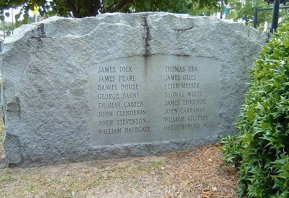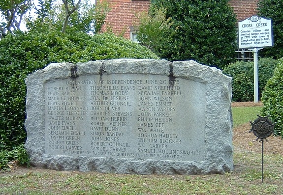 A monument in a small park on Bow Street at Person Street in downtown Fayetteville lists on its front and back 55 signers of the Liberty Point Resolves.